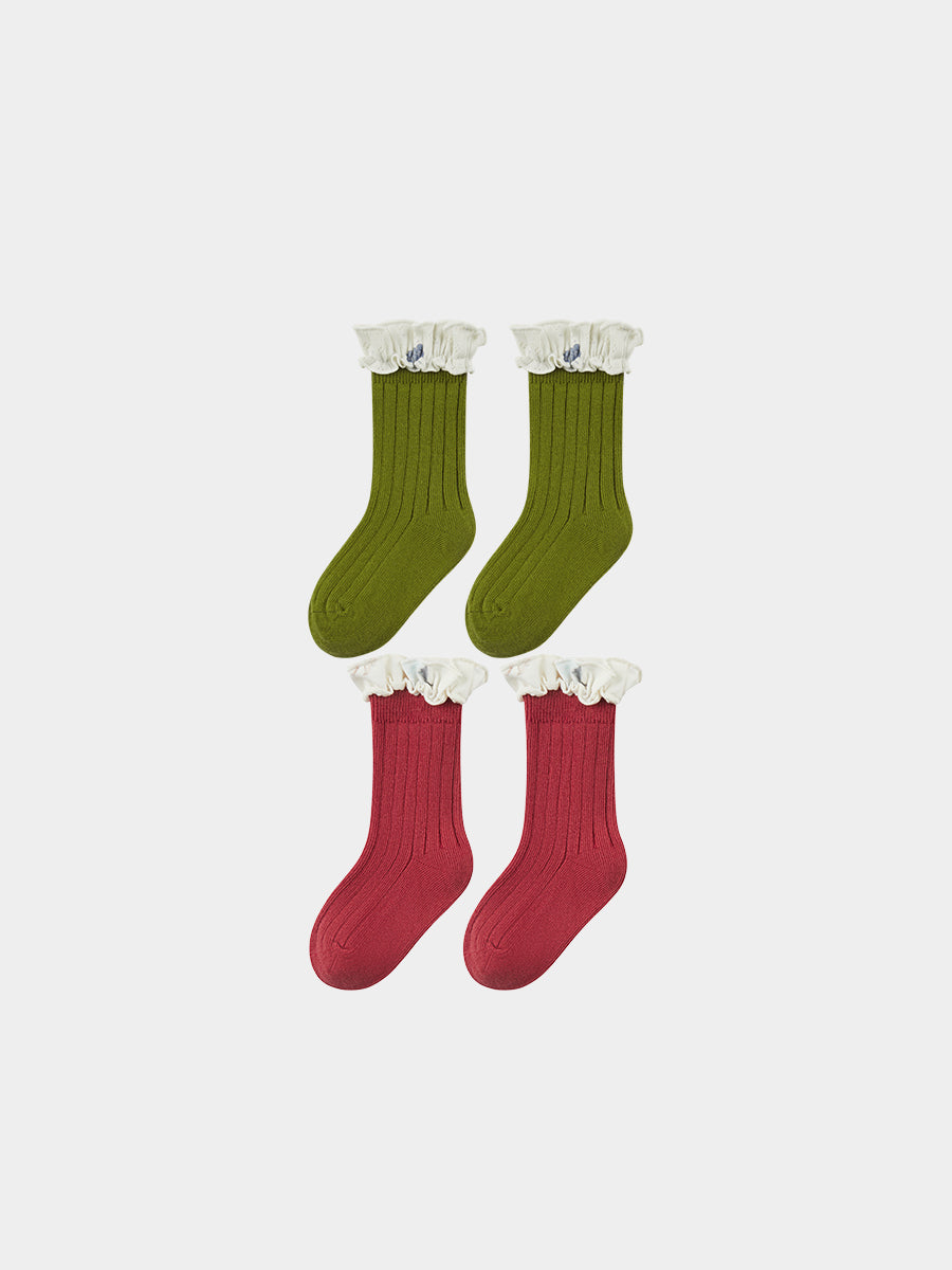 Jessielle Ankle Socks with Floral Ruffle, Pomegranate Red & Avocado Green