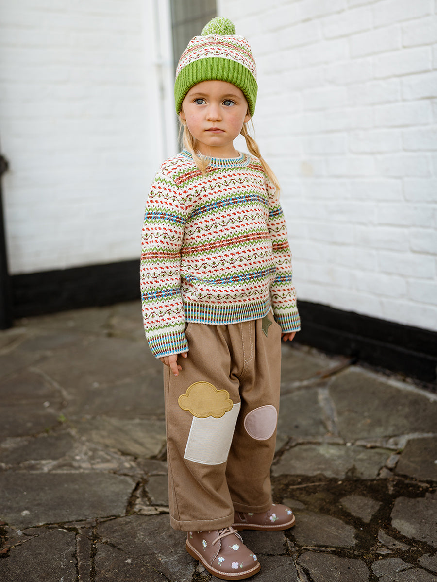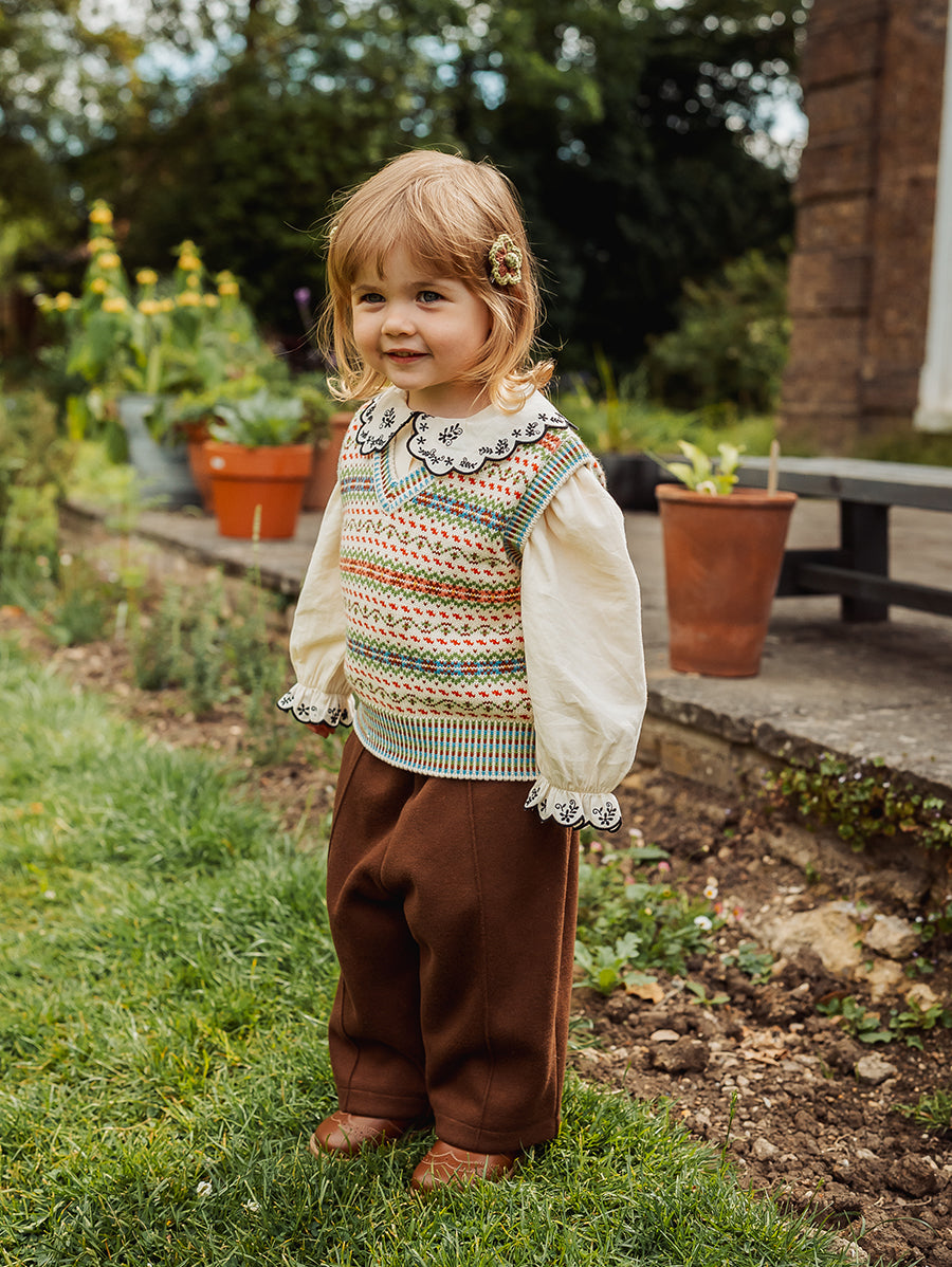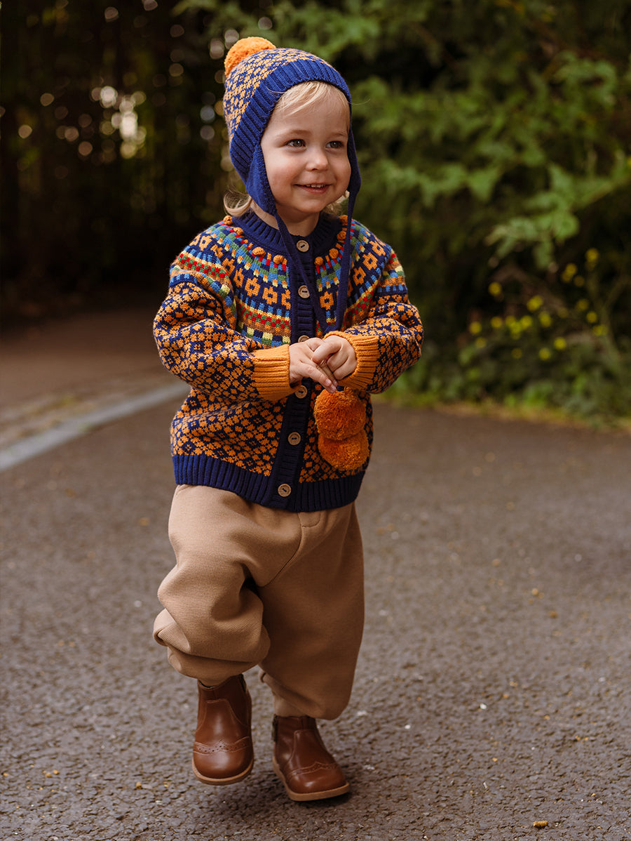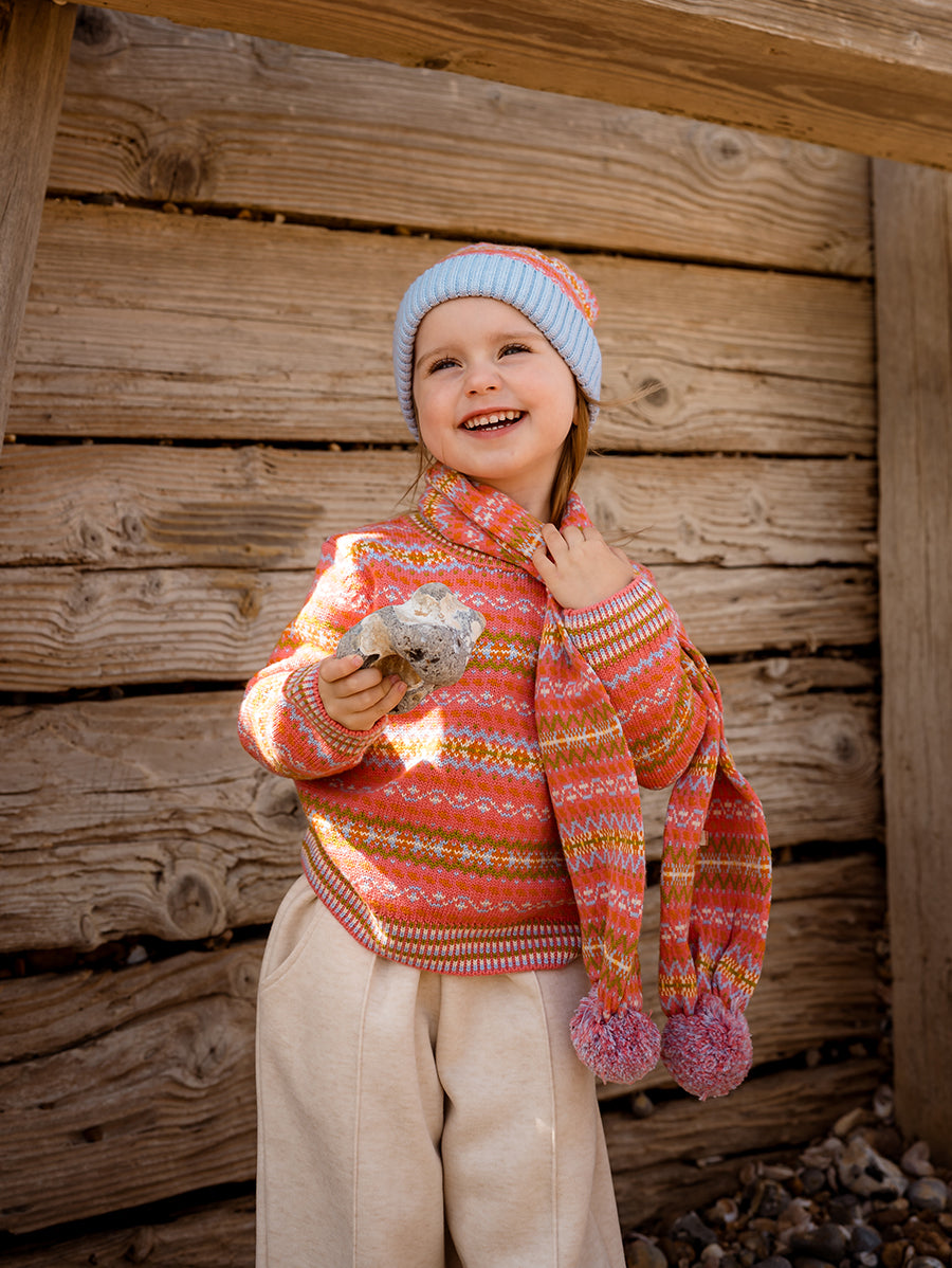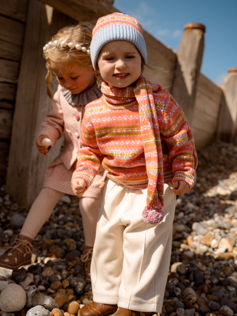 Crafted from the finest natural yarns - plush cashmere, extra-fine merino wool, and soft cotton - our knitwear wraps little ones in breathable warmth and everyday comfort. From timeless silhouettes to our signature Fair Isle patterns, each piece is designed and knitted in-house.