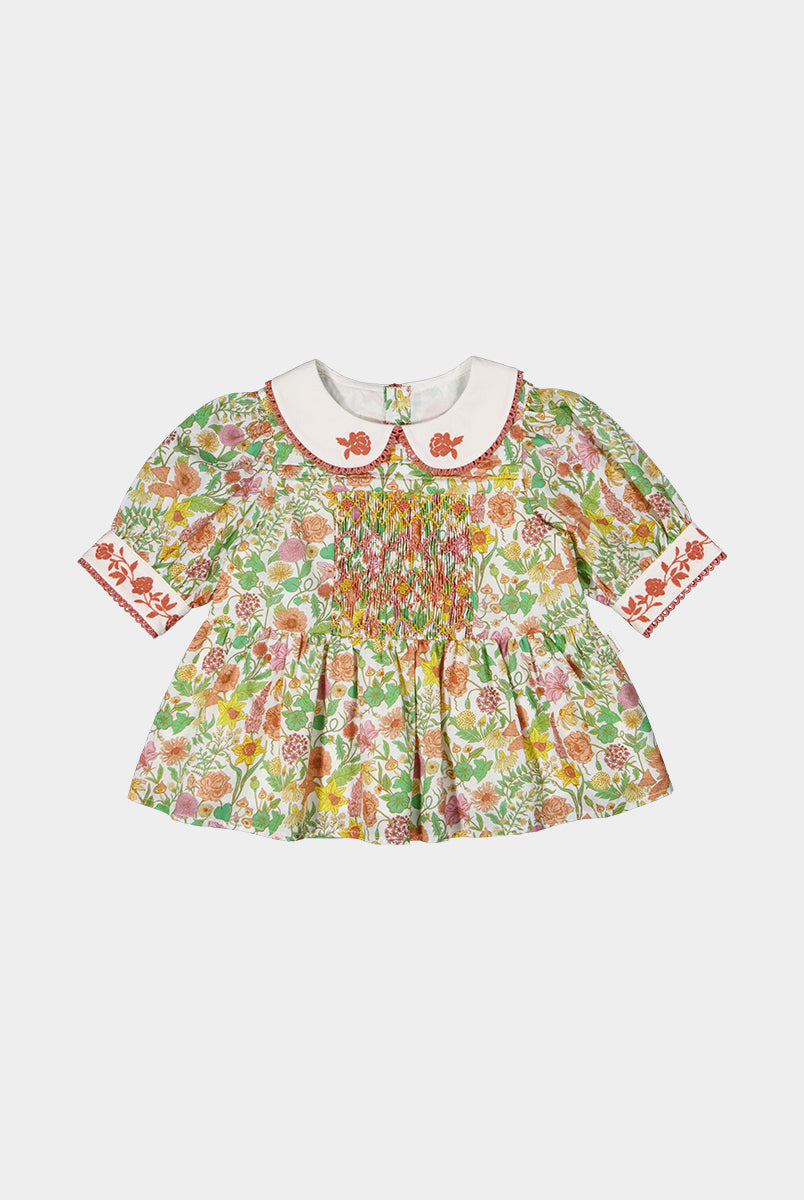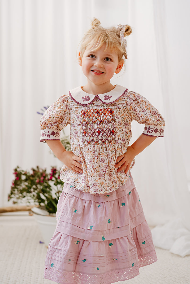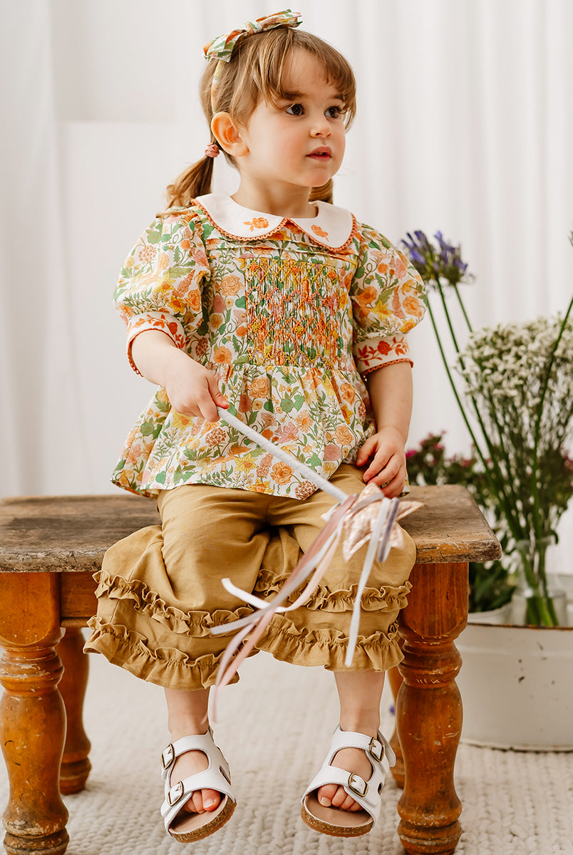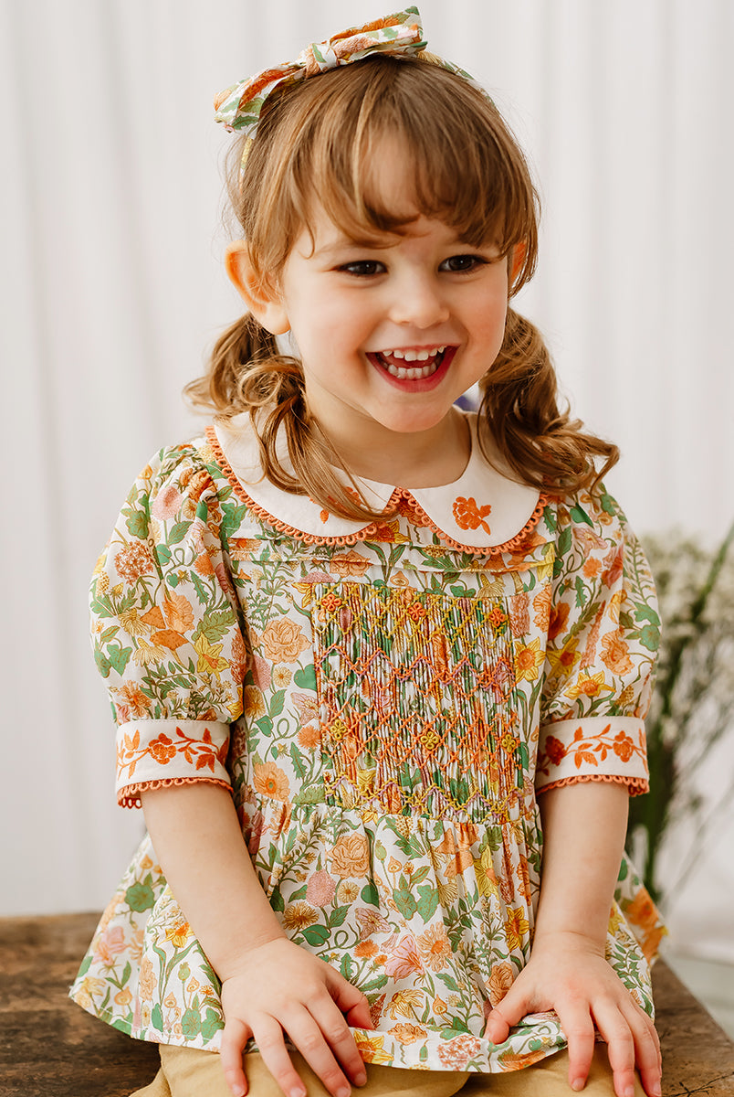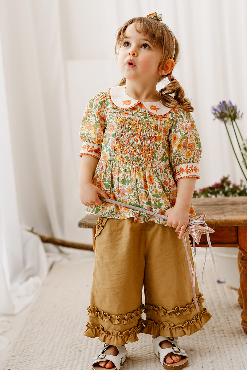 I adore the Quinn ladybird romper, the khaki ladybird embroidered trousers are also a favourite. And the Lindsey hand-smocking blouse – the romantic frills are adorable and such a pretty print.
