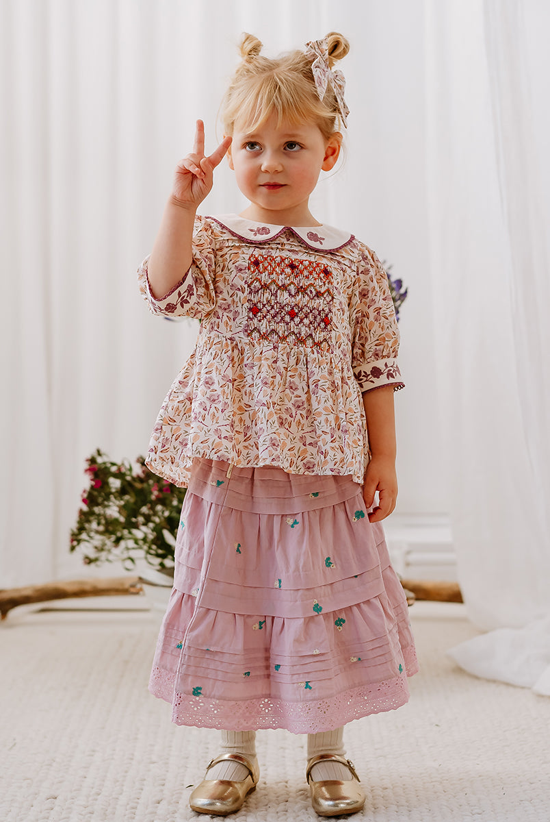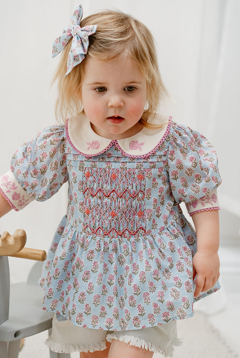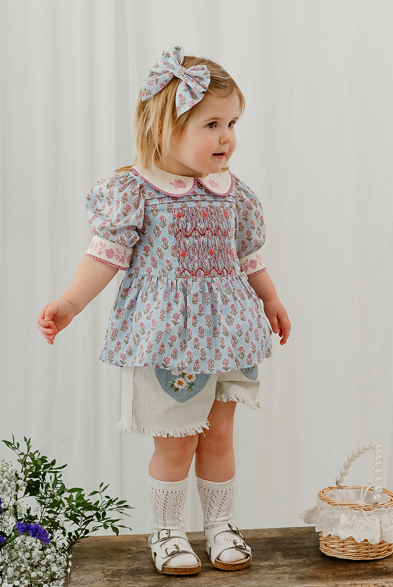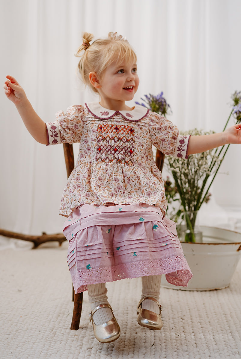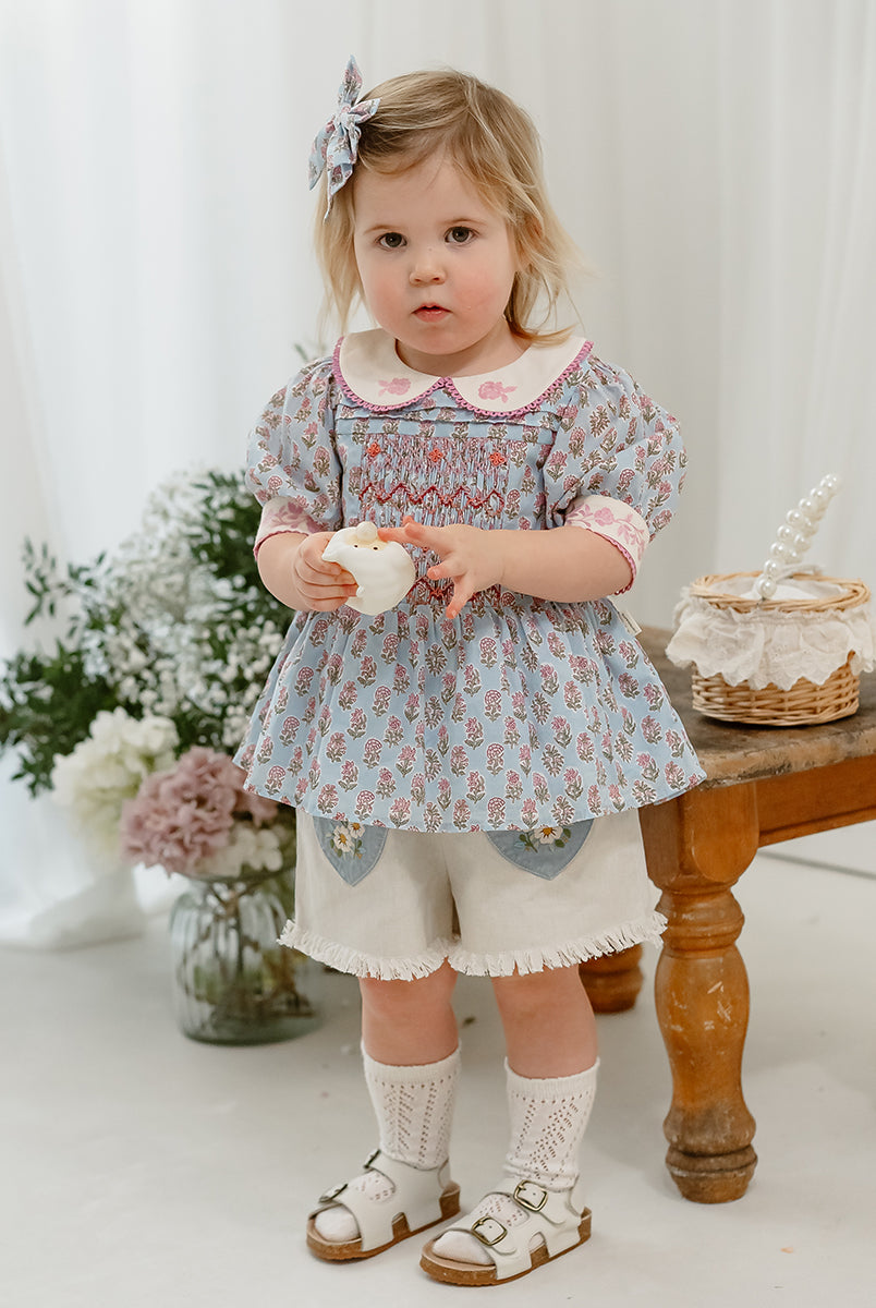 I adore the Quinn ladybird romper, the khaki ladybird embroidered trousers are also a favourite. And the Lindsey hand-smocking blouse – the romantic frills are adorable and such a pretty print.