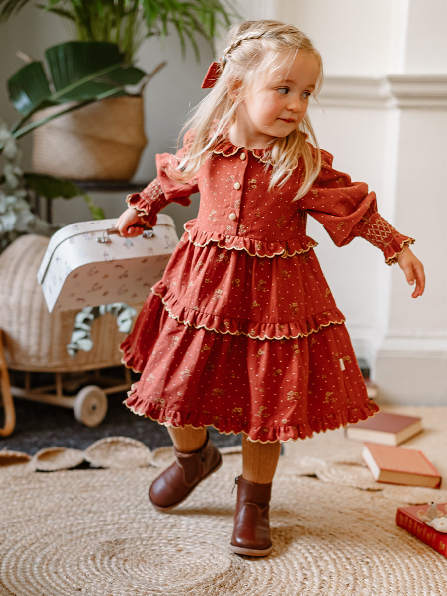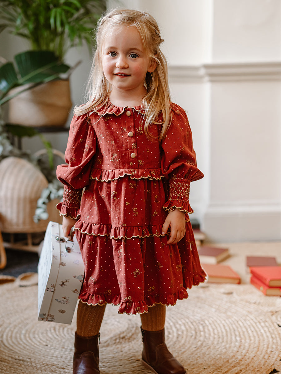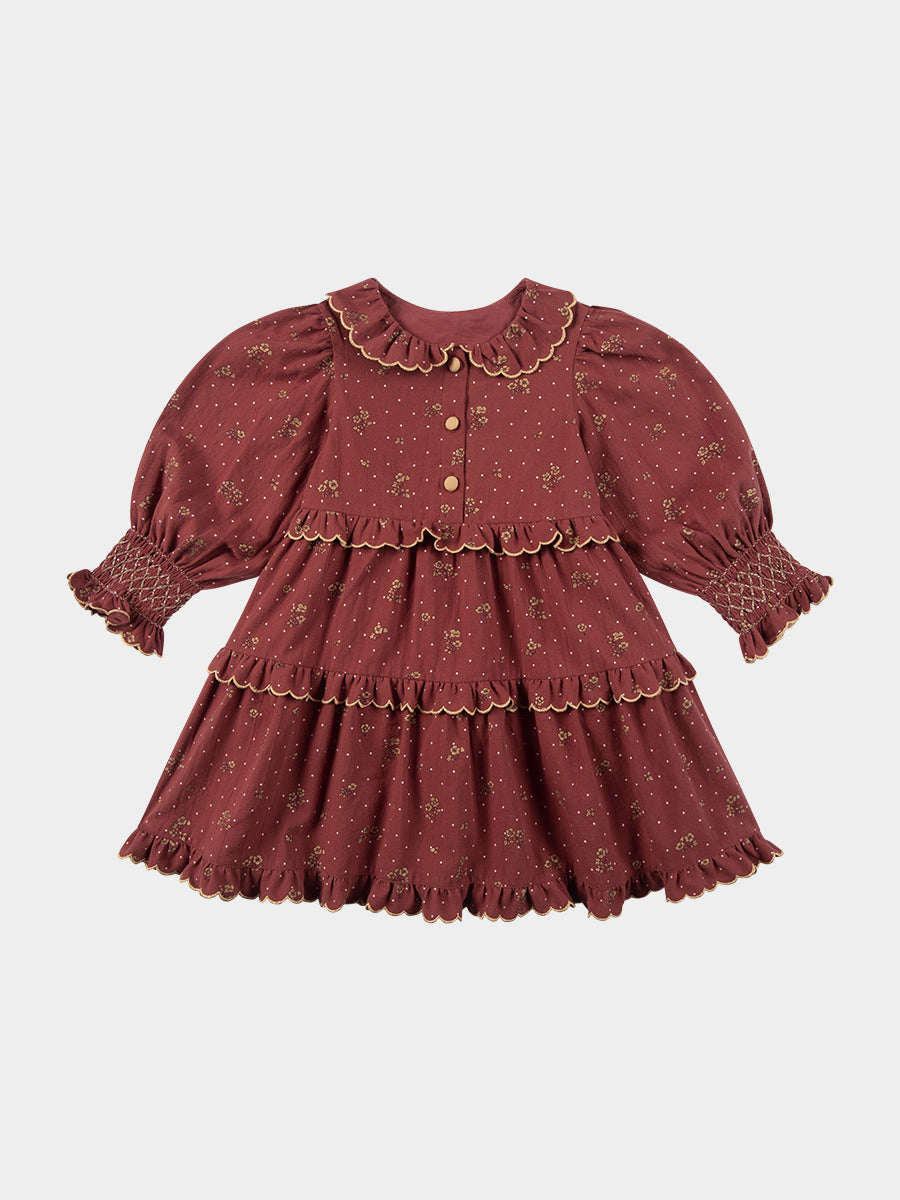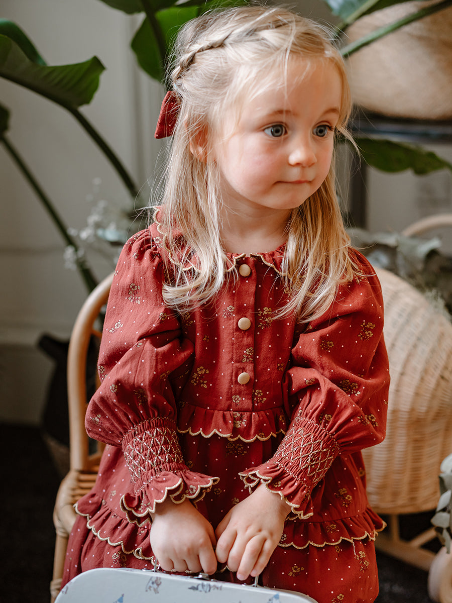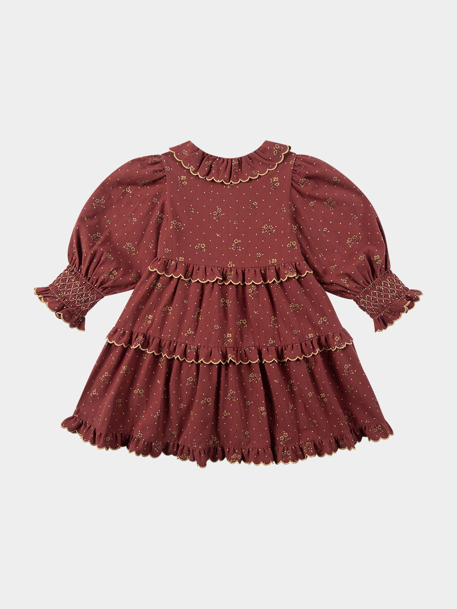 Celine Smocking Dress, Wildflower Polka, Burgundy
