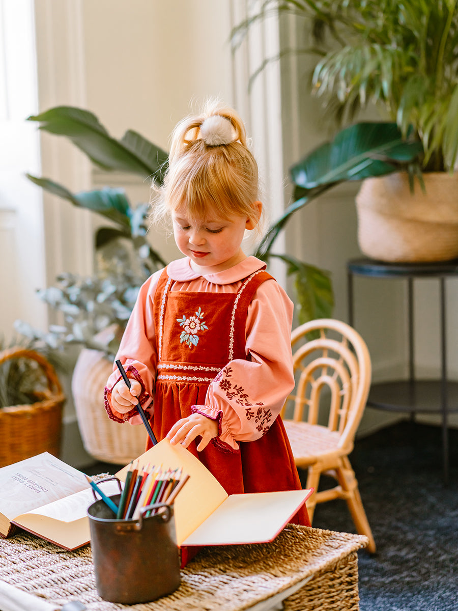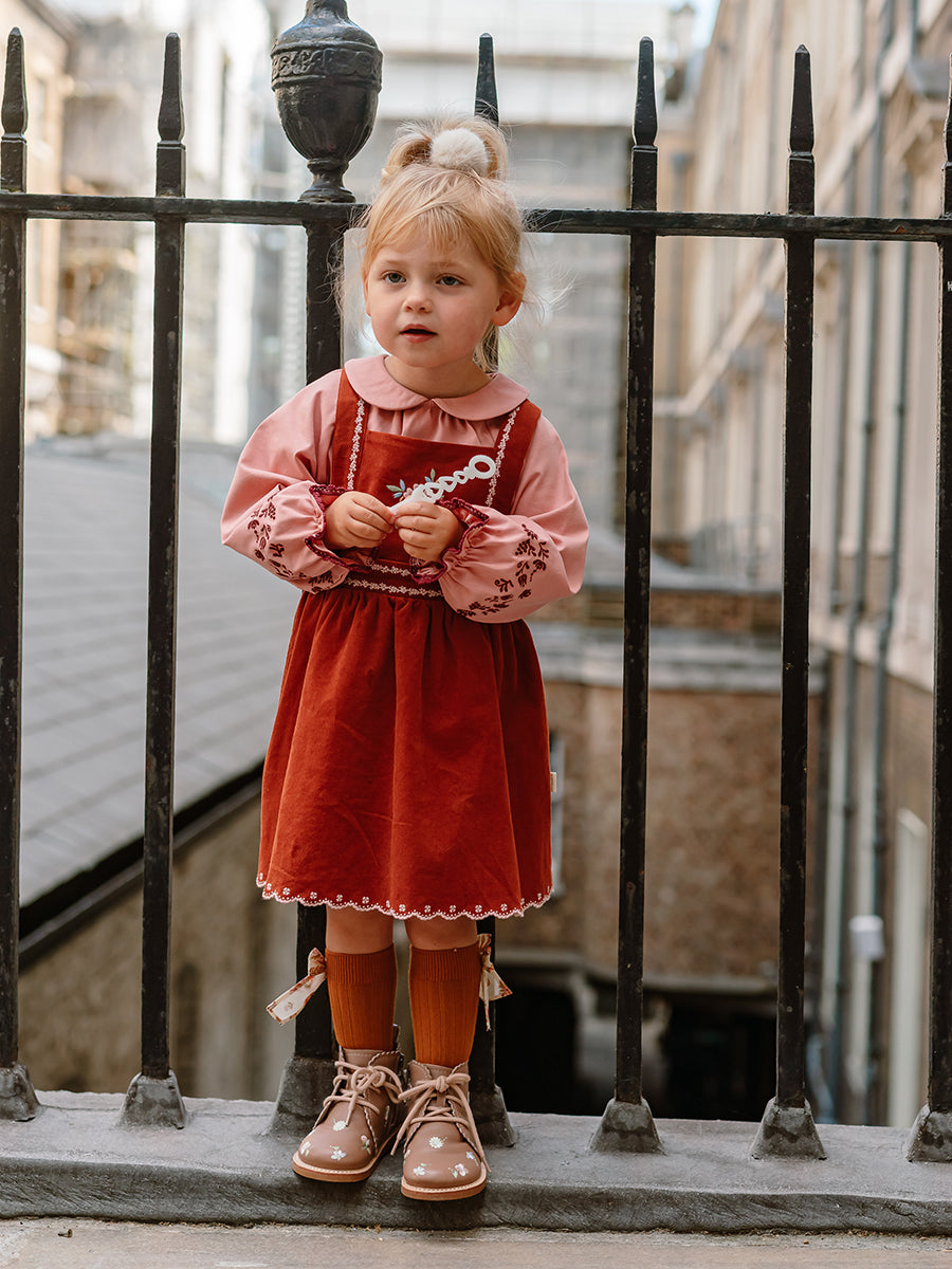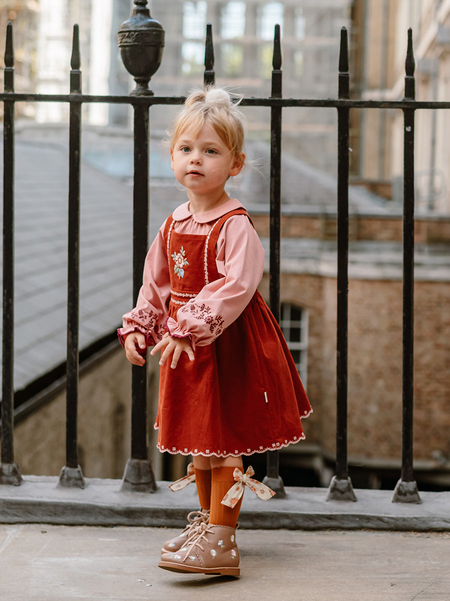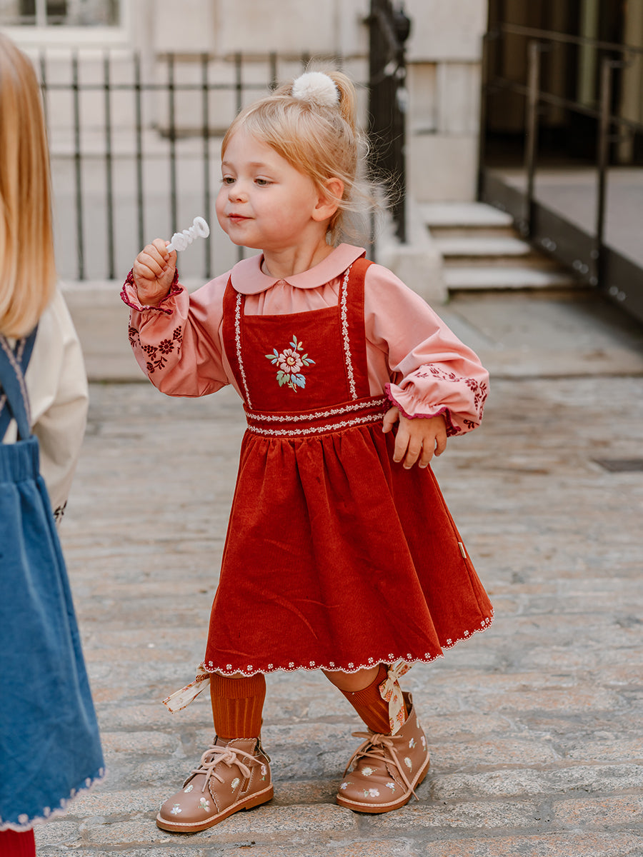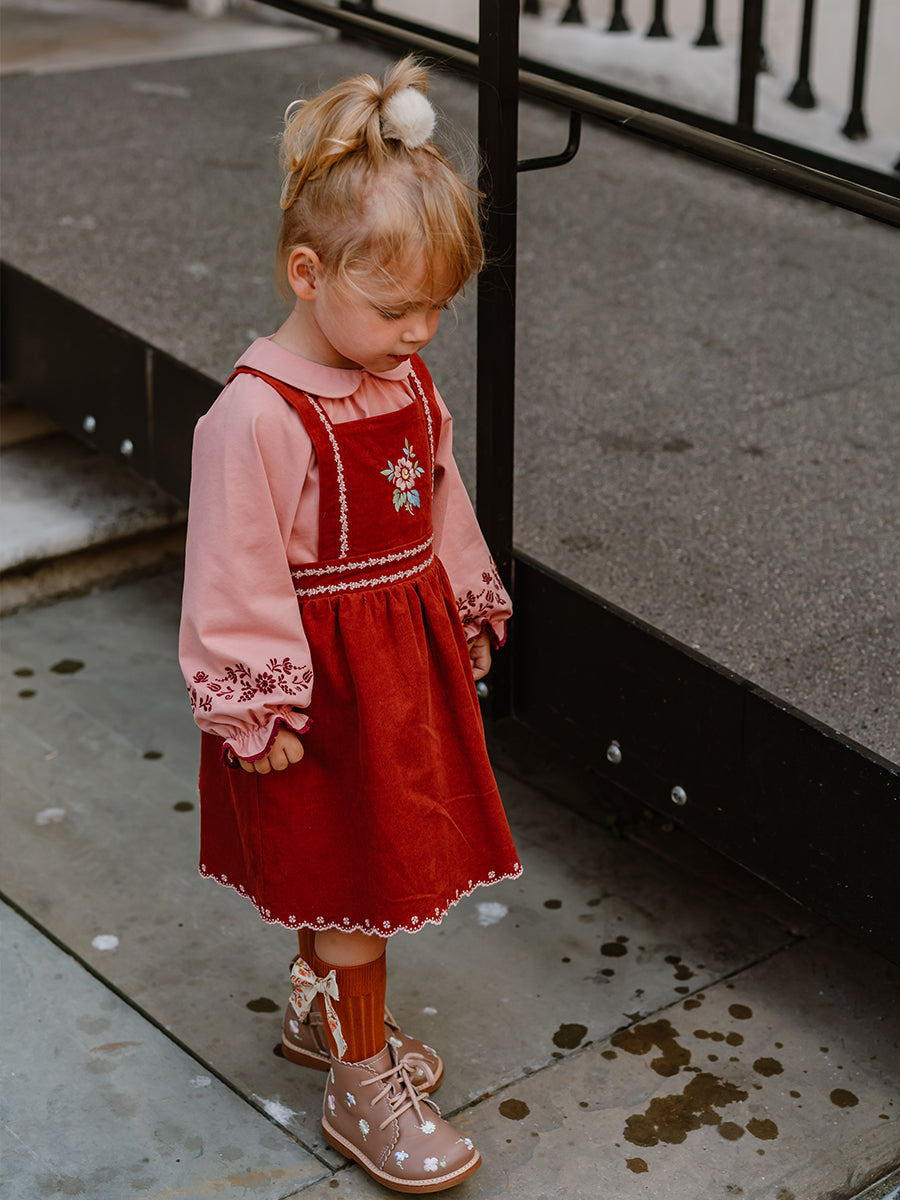 Kalmia Embroidered Corduroy Overall Dress, Misty Pink