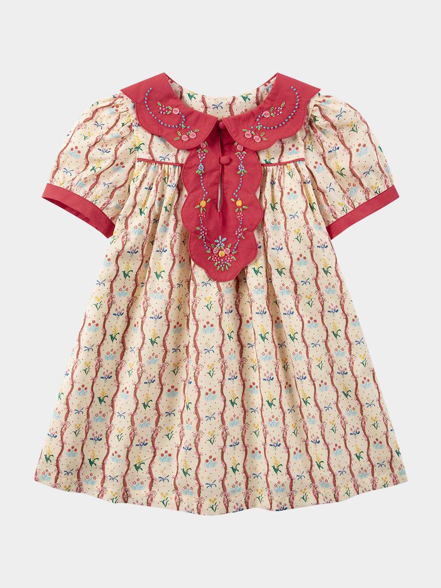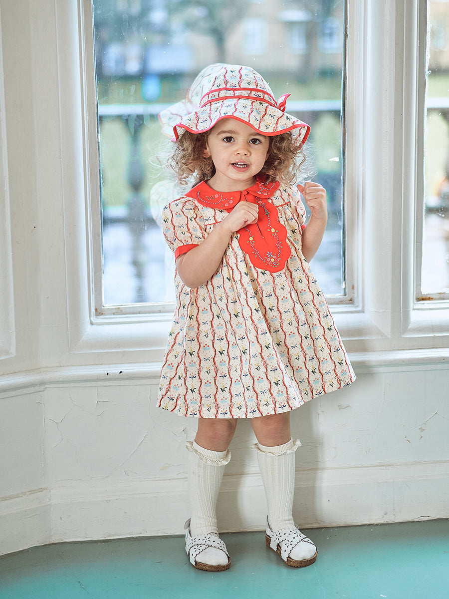 Mira Hand Embroidered Dress, Vintage Vine Stripes Red