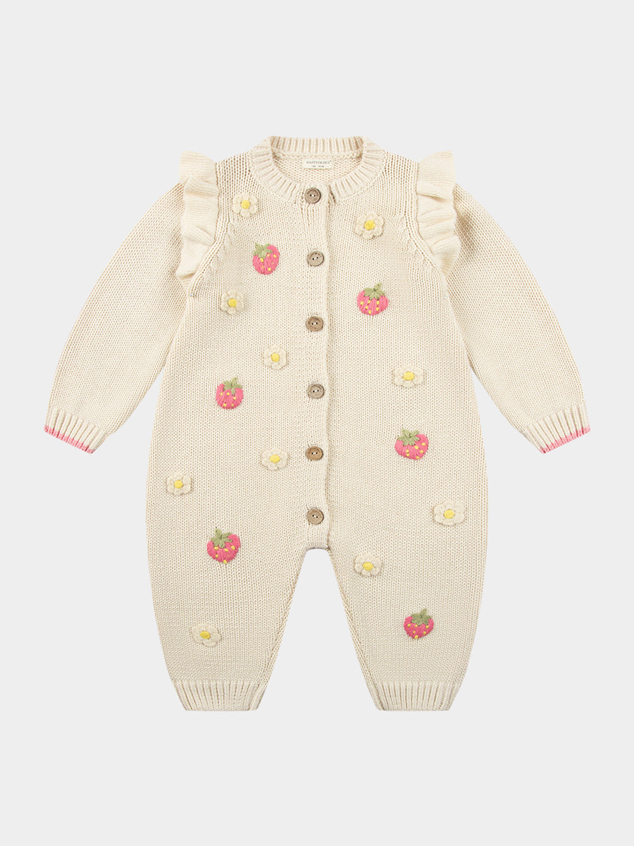 Strawberry Hand-Embroidered Romper, Crème Brulee